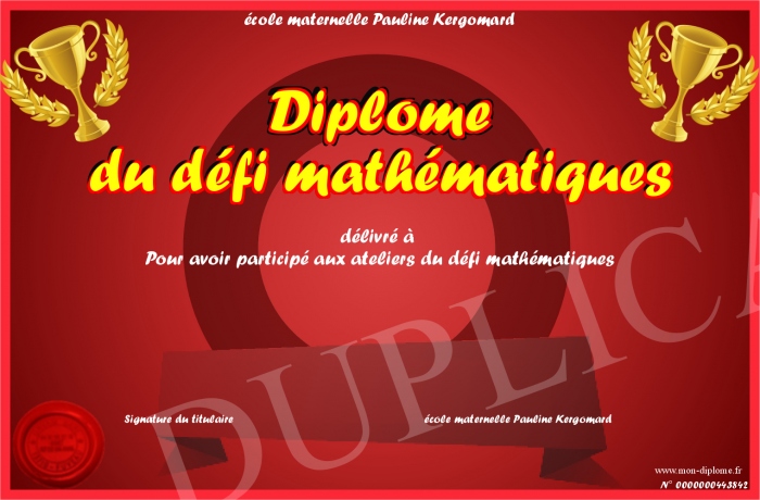 Envoyez par email votre Diplôme du défi mathématiques personalisé