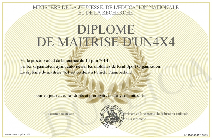 Envoyez par email votre Diplôme de maitrise d'un4x4 personalisé