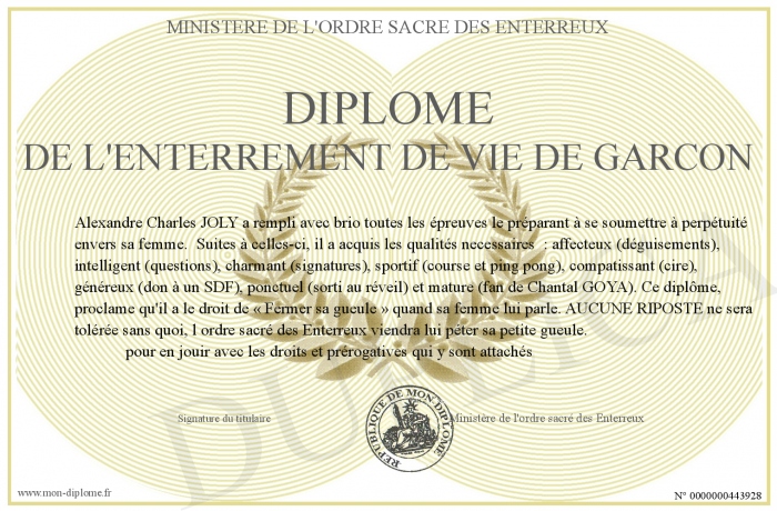 Envoyez par email votre Diplôme de l'enterrement de vie de garcon personalisé