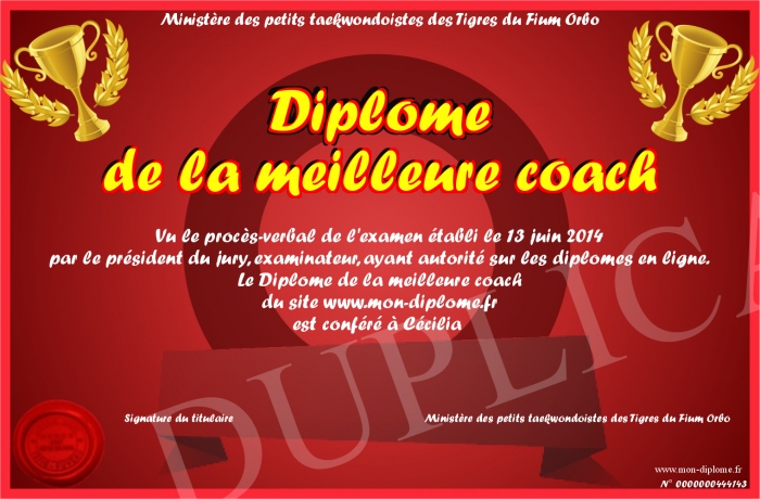 Envoyez par email votre Diplôme de la meilleure coach personalisé