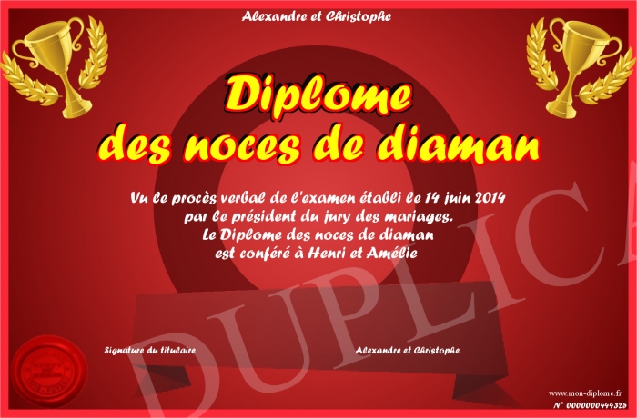 Envoyez par email votre Diplome des noces de diaman personalisé