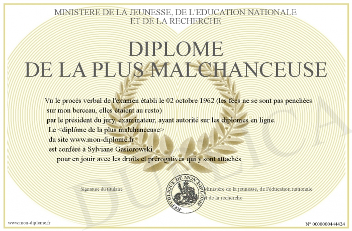 Envoyez par email votre Diplôme de la plus malchanceuse personalisé
