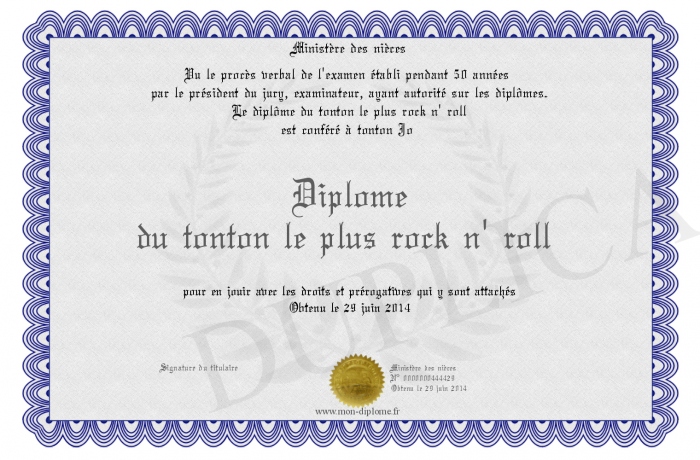 Envoyez par email votre Diplôme du tonton le plus rock n' roll personalisé