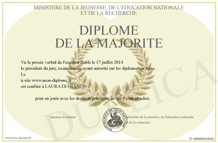 Envoyez par email votre Diplôme de la majorite personalisé
