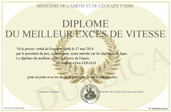 Envoyez par email votre Diplôme du meilleur excès de vitesse personalisé