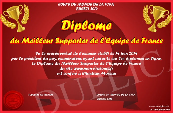 Envoyez par email votre Diplôme du Meilleur Supporter de l'Equipe de France personalisé