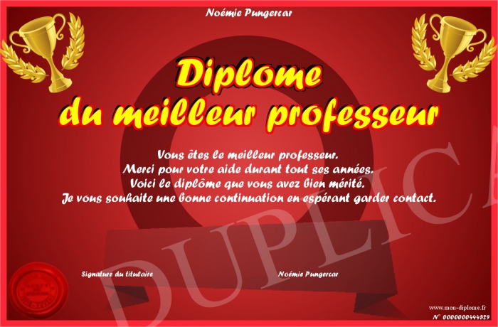 Envoyez par email votre Diplôme du meilleur professeur personalisé