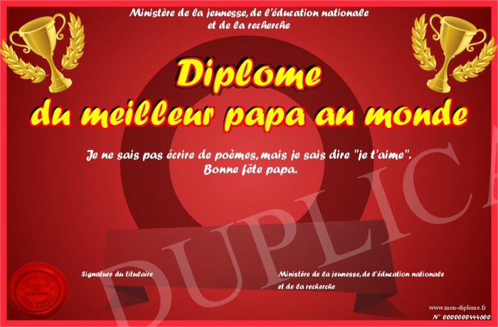 Envoyez par email votre Diplôme du meilleur papa au monde personalisé