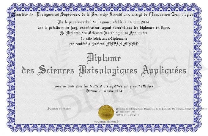 Envoyez par email votre Diplôme des Sciences Baisologiques Appliquées personalisé