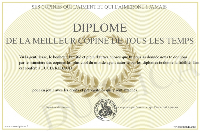 Envoyez par email votre Diplôme de la meilleur copine de tous les temps personalisé