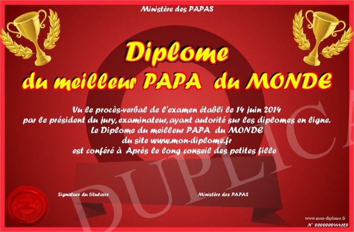 Envoyez par email votre Diplôme du meilleur PAPA du MONDE personalisé