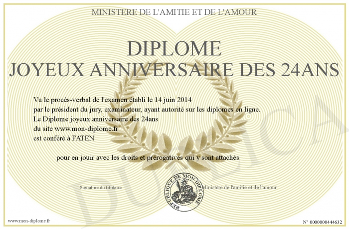 Envoyez par email votre Diplôme joyeux anniversaire des 24ans personalisé