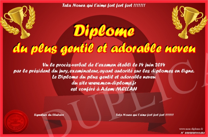 Envoyez par email votre Diplôme du plus gentil et adorable neveu personalisé