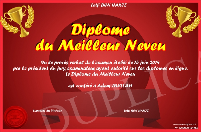 Envoyez par email votre Diplôme du Meilleur Neveu personalisé