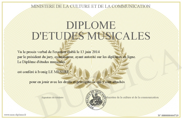Envoyez par email votre Diplôme d'études musicales personalisé