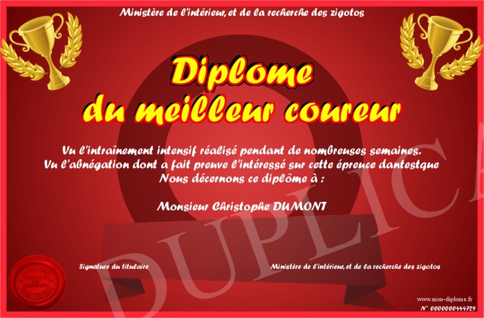 Envoyez par email votre Diplôme du meilleur coureur personalisé