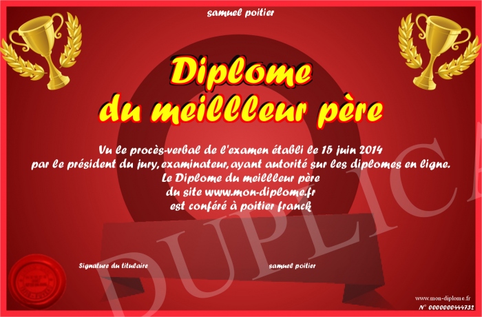 Envoyez par email votre Diplôme du meillleur père personalisé