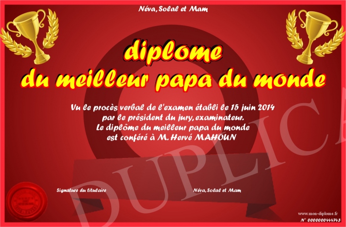 Envoyez par email votre diplôme du meilleur papa du monde personalisé