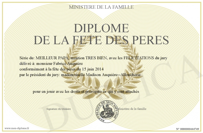 Envoyez par email votre Diplôme de la FETE des PERES personalisé