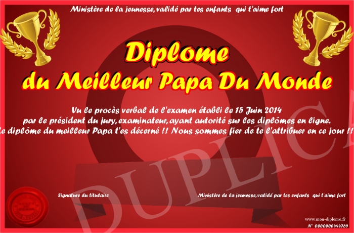 Envoyez par email votre Diplôme du Meilleur Papa Du Monde personalisé