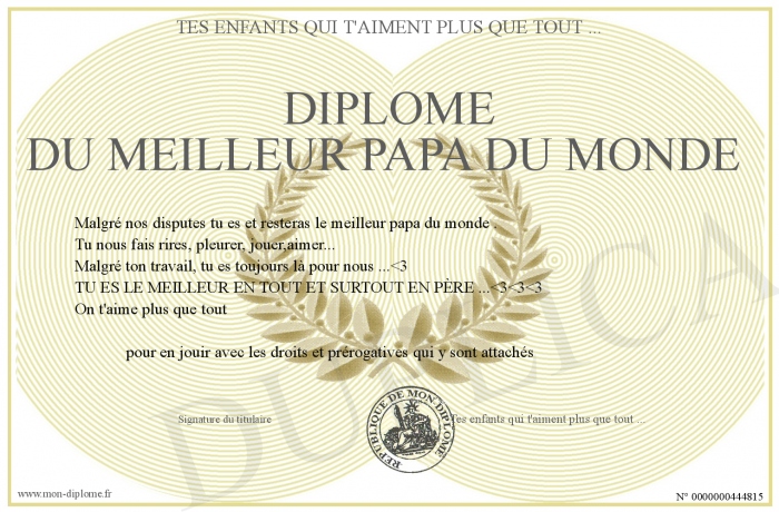 Envoyez par email votre Diplôme du meilleur papa du monde personalisé