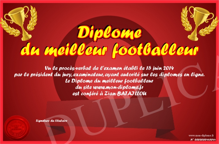 Envoyez par email votre Diplôme du meilleur footballeur personalisé