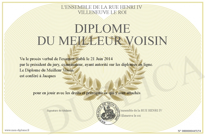 Envoyez par email votre Diplôme du Meilleur Voisin personalisé