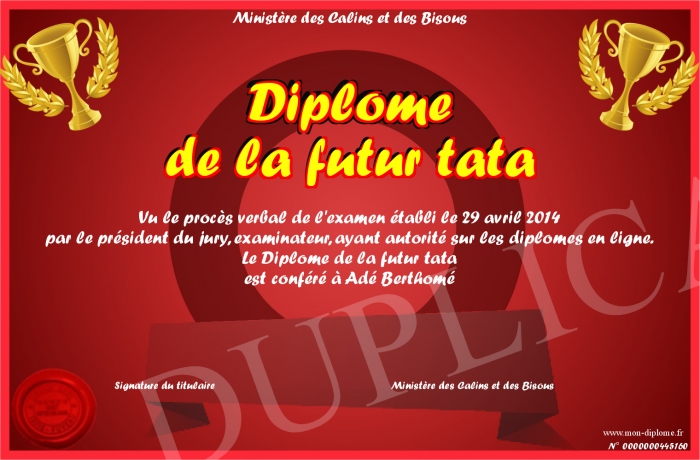 Envoyez par email votre Diplôme de la futur tata personalisé