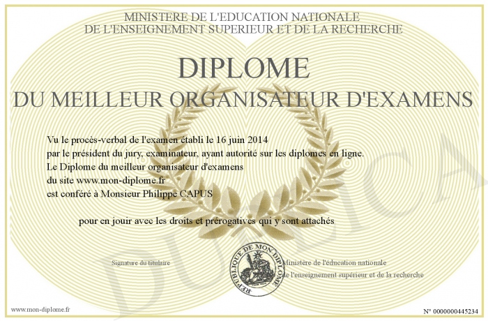 Envoyez par email votre Diplôme du meilleur organisateur d'examens personalisé