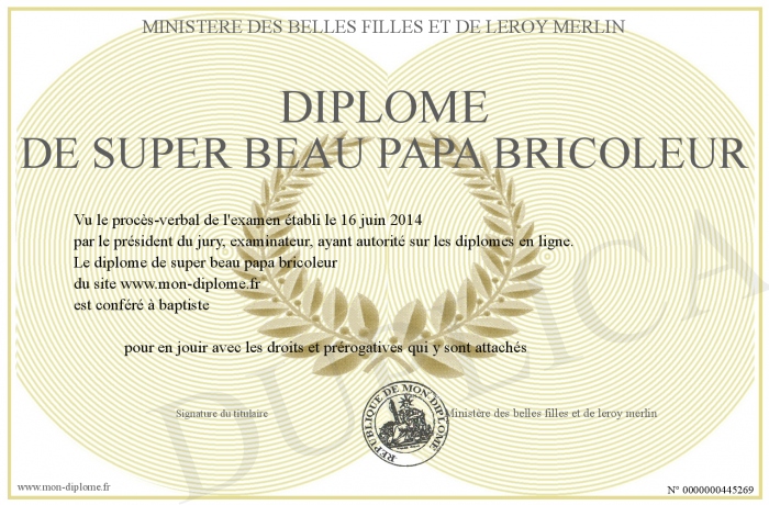 Envoyez par email votre diplome de super beau papa bricoleur personalisé