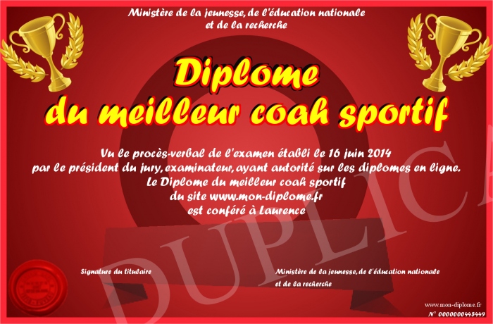 Envoyez par email votre Diplome du meilleur coah sportif personalisé