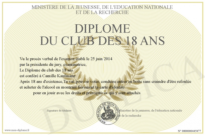 Envoyez par email votre Diplôme du club des 18 ans personalisé