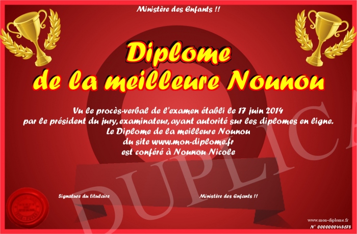 Envoyez par email votre Diplome de la meilleure Nounou personalisé