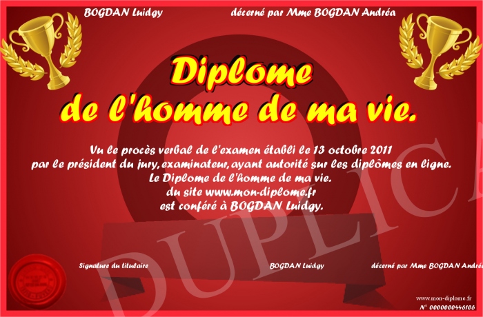 Envoyez par email votre Diplôme de l'homme de ma vie. personalisé