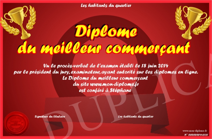 Envoyez par email votre Diplôme du meilleur commerçant personalisé