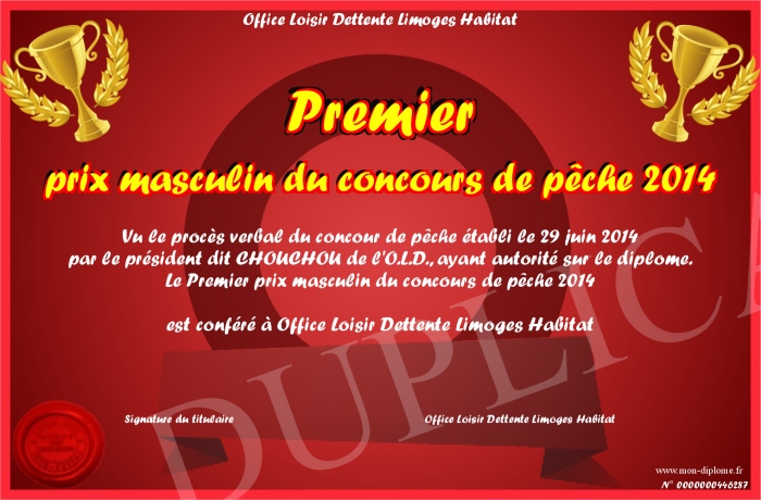 Envoyez par email votre Premier prix masculin du concours de pêche 2014 personalisé
