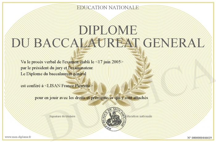 Envoyez par email votre Diplôme du baccalaureat général personalisé