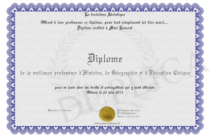 Envoyez par email votre Diplôme de la meilleure professeur d'Histoire, de Géographie et d'Education Civique personalisé