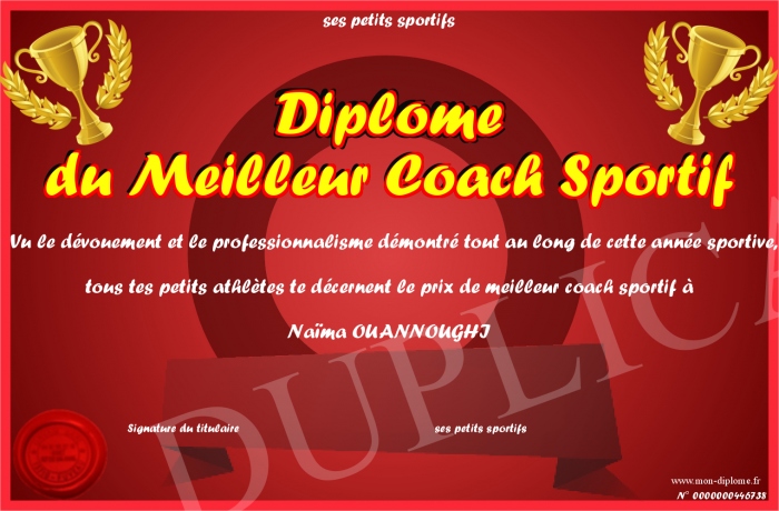 Envoyez par email votre Diplôme du Meilleur Coach Sportif personalisé