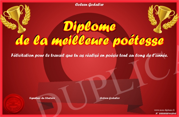 Envoyez par email votre Diplôme de la meilleure poétesse personalisé