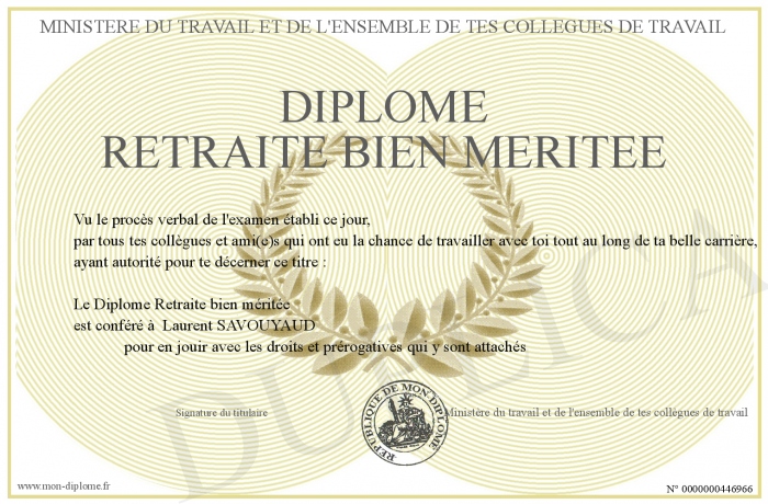 Envoyez par email votre Diplôme Retraite bien méritée personalisé