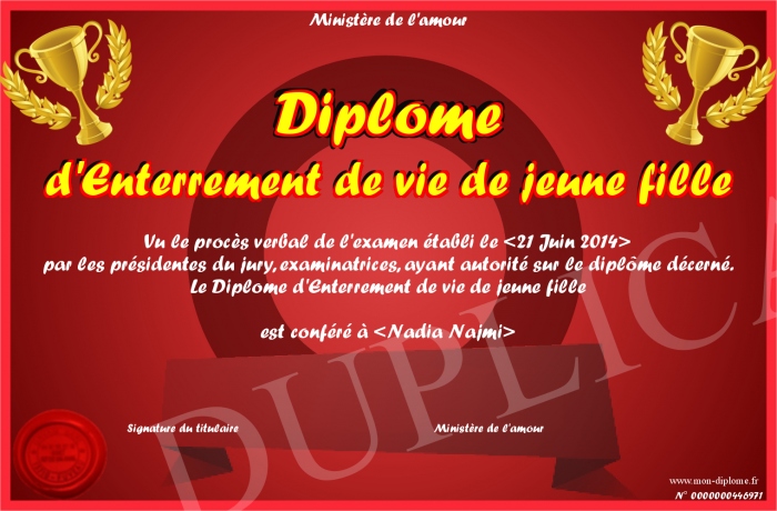 Envoyez par email votre Diplome d'Enterrement de vie de jeune fille personalisé