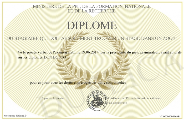 Envoyez par email votre Diplôme du Stagiaire qui doit absolument trouver un stage dans un zoo!!! personalisé