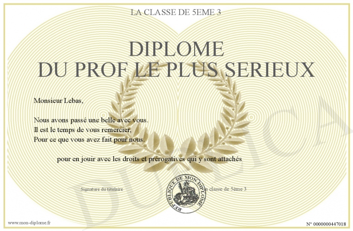 Envoyez par email votre Diplôme du prof le plus sérieux personalisé