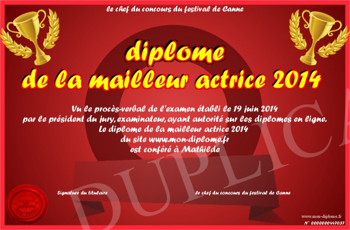 Envoyez par email votre diplôme de la mailleur actrice 2014 personalisé