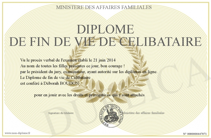Envoyez par email votre Diplôme de fin de vie de Célibataire personalisé
