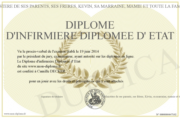 Envoyez par email votre Diplôme d'infirmière Diplômée d' Etat personalisé