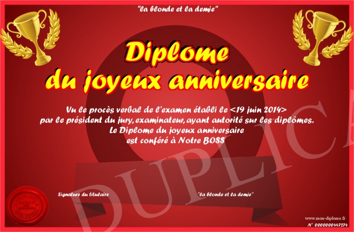 Envoyez par email votre Diplôme du joyeux anniversaire personalisé