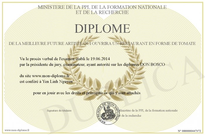 Envoyez par email votre Diplôme de la meilleure future artiste qui ouvrira un restaurant en forme de tomate personalisé