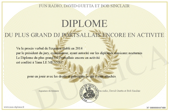 Envoyez par email votre Diplôme du plus grand DJ Portsallais encore en activité personalisé